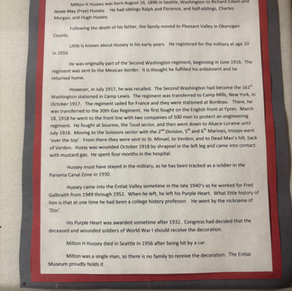In the late 1940's, Milton Harry Hussey came to the Entiat Valley and worked for Fred Galbraith harvesting apples. When he left, he left his Purple Heart in the orchard housing that he stayed in. The Purple Heart was originally established by George Washington on August 7, 1782, as the "Badge of Military Merit". It was created during the Revolutionary War to recognize the "bravery and fidelity" of common soldiers. The medal features a bust of George Washington, the man who led the Continental Army to defend the principles laid out in the 1775 Declaration.