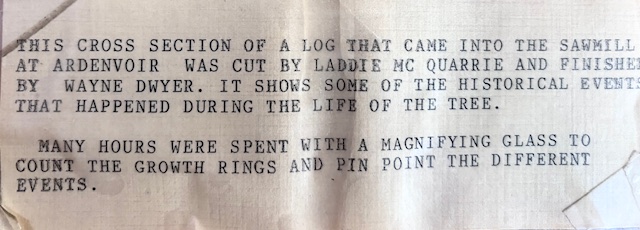 In 1776, a Douglas Fir grew in a beautiful forest in the Entiat Valley. By that year it was over 100 years old and may have reached a height of 80 to 100 feet. It grew strong, dense with a dark center of heartwood. In 1970, the three-hundred-year-old Doug Fir was cut and brought to the Harris Mill in Ardenvoir to become lumber. Laddie McQuarrie and Wayne Dwyer spent many weeks counting the growth rings and noting what events happened during this tree's lifetime.